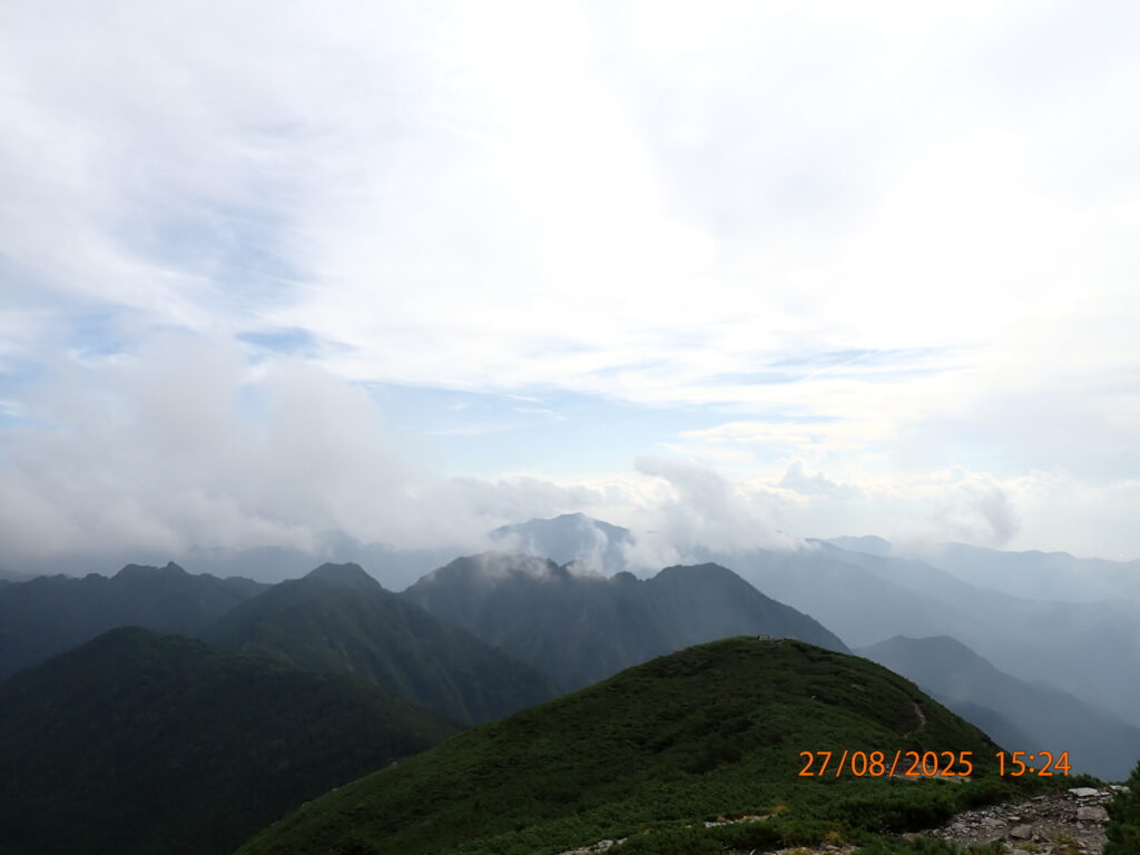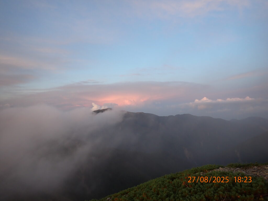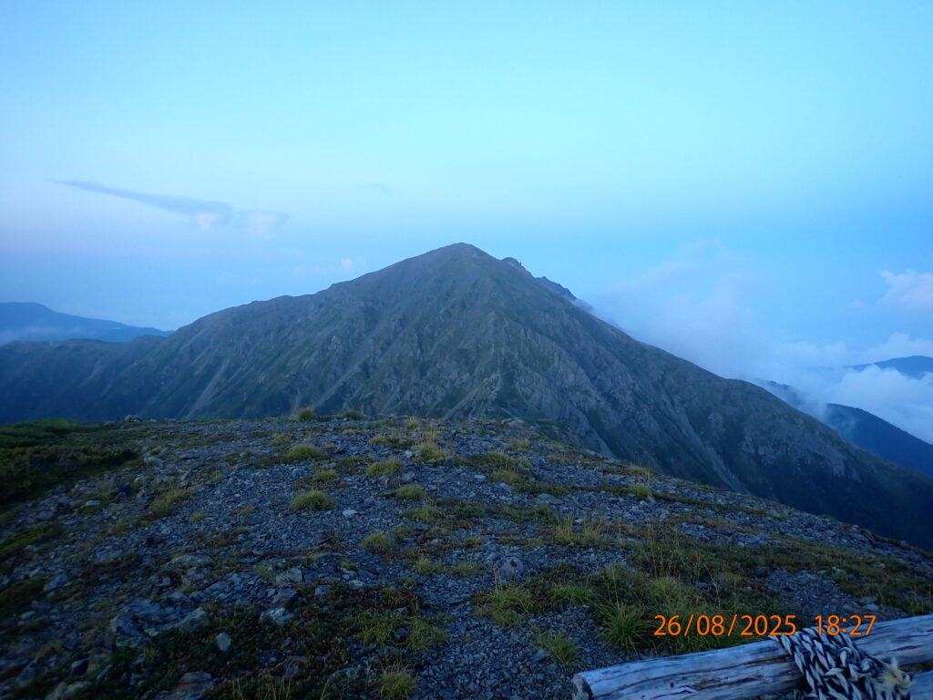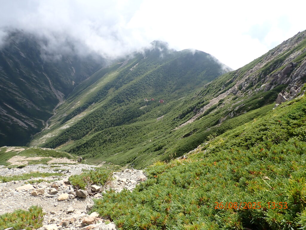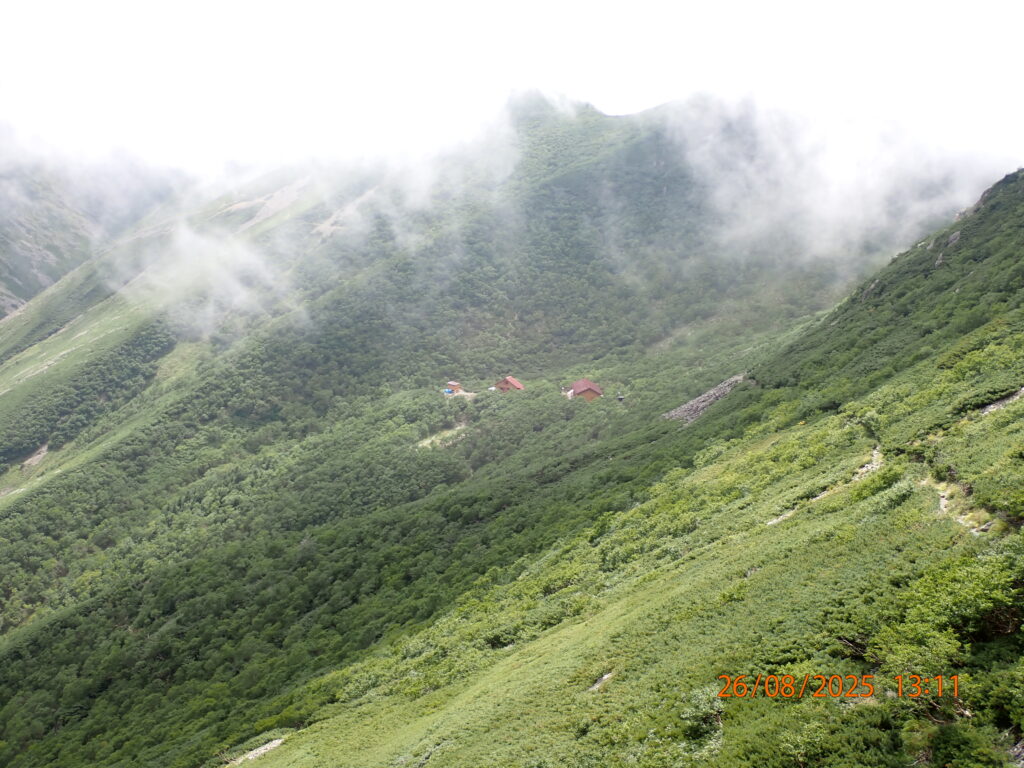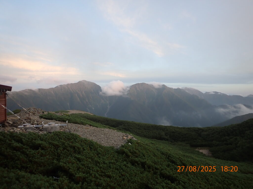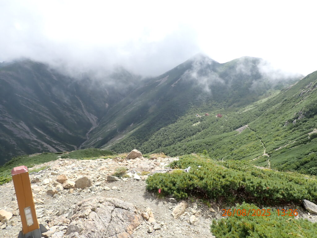 チェックインして、13時10分塩見岳へ出発。途中雲行き怪しい、普通3時間くらいだそう、俺だったら4時間か。17時前後か。迷って迷って、断念する。戻る途中登る人4人ほどいたが、人は人、俺は俺と、きっぱり諦めたけど、悔しい。
