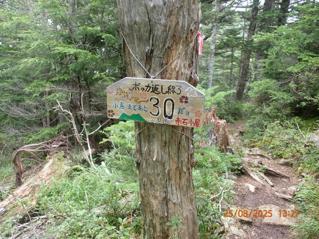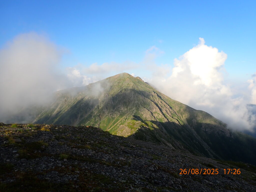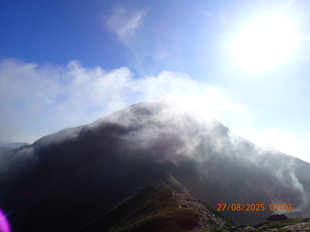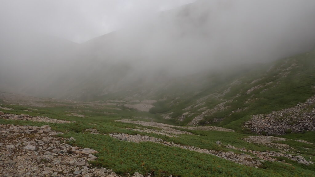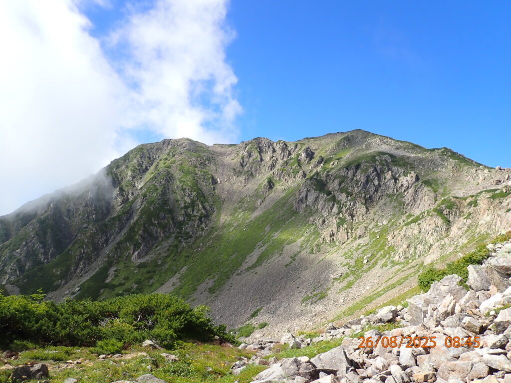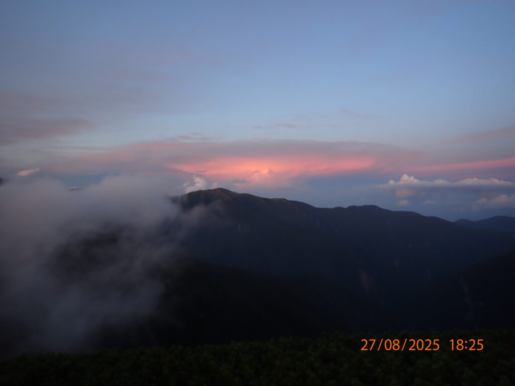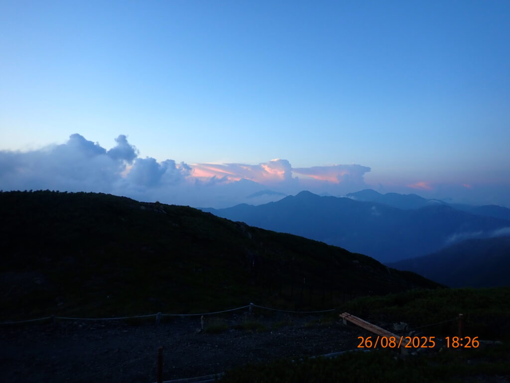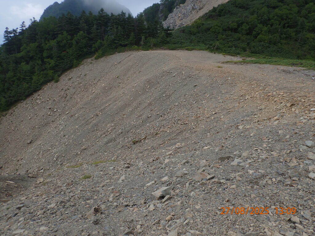 チェックインして、13時10分塩見岳へ出発。途中雲行き怪しい、普通3時間くらいだそう、俺だったら4時間か。17時前後か。迷って迷って、断念する。戻る途中登る人4人ほどいたが、人は人、俺は俺と、きっぱり諦めたけど、悔しい。